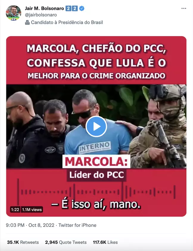 O presidente e candidato à reeleição Jair Bolsonaro (PL) fez uma publicação no Twitter no sábado (8.out.22) com o áudio descontextualizado em que o traficante Marcola, líder do PCC (Primeiro Comando da Capital), declara preferência pelo candidato à Presidência Luiz Inácio Lula da Silva (PT), afrontando uma decisão da Justiça Eleitoral.