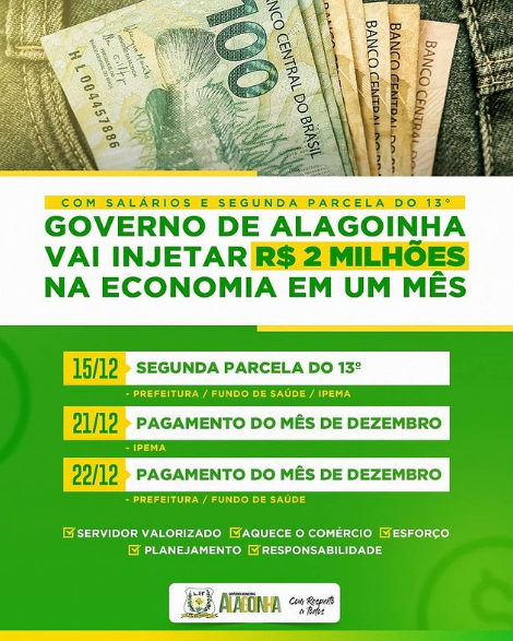A Prefeitura de Alagoinha iniciou nesta terça-feira (15) os pagamentos dos servidores públicos do município. Será efetuado o pagamento da segunda parcela do 13º salário nesta terça-feira (15), além do salário referente ao mês de dezembro, a partir do dia 21.