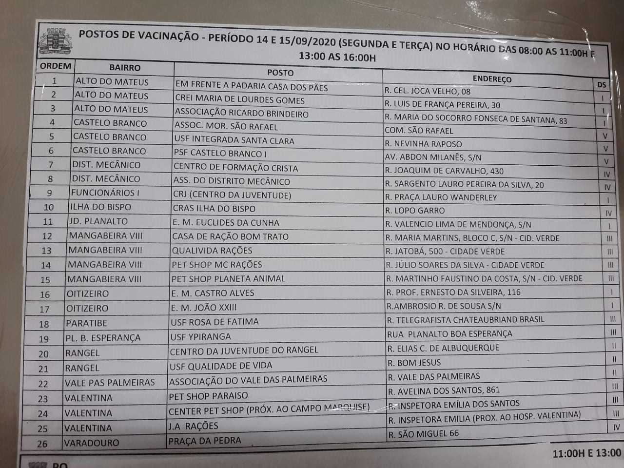 Na segunda e terça-feira (15) desta semana, os postos itinerantes serão deslocados para os bairros do Alto do Mateus, Castelo Branco, Distrito Mecânico, Funcionários, Ilha do Bispo, Jardim Planalto, Mangabeira VIII, Oitizeiro, Paratibe, Planalto Boa Esperança, Rangel, Vale das Palmeiras e Valentina (os endereços você confere ao final da matéria).
