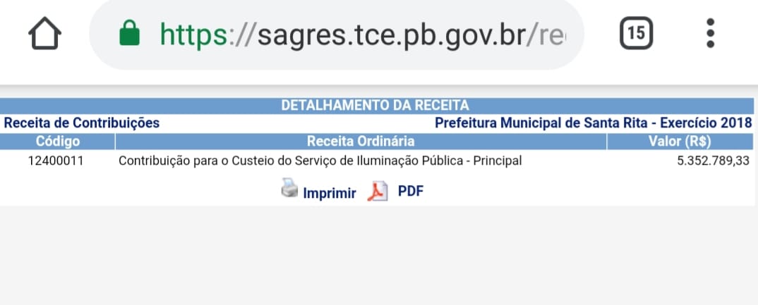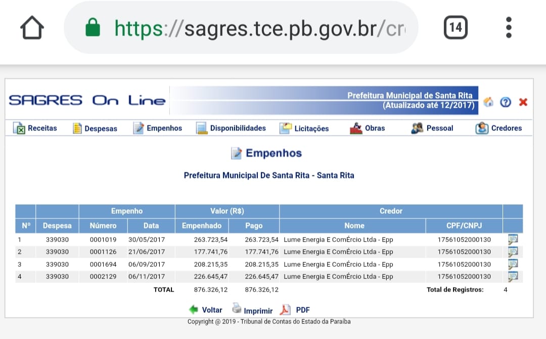Esse são os valores exatos transferidos para os cofres municipais. Desse montante, em 2 anos e um mês de gestão foi pago com gastos do setor de Iluminação Pública de Santa Rita, os seguintes valores: