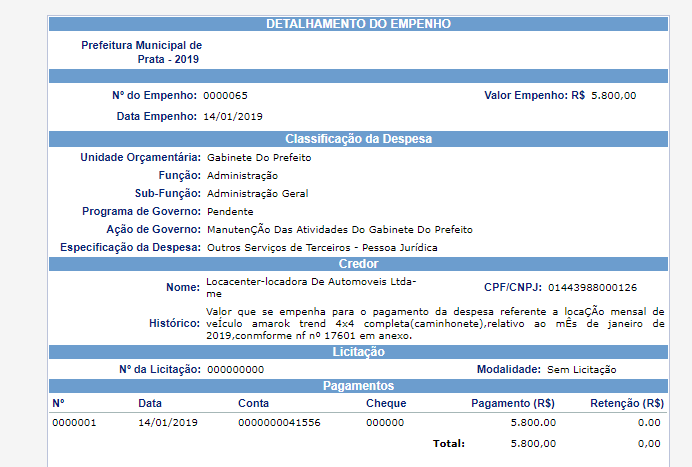 Os gastos com o veículo de luxo são referentes aos anos de 2016,2017,2018 e os meses de janeiro e fevereiro de 2019. Os aluguéis do veículo de luxo foram pagos a empresa Locacenter-locadora de Automóveis-Me, que tem sede no bairro de Miramar, em João Pessoa.