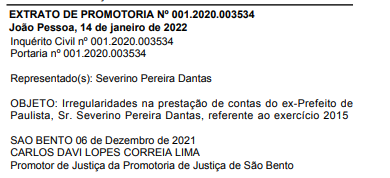 O promotor de Justiça da Promotoria de São Bento, Carlos Davia Lopes Correia Lima, determinou a instauração do inquérito civil nº 001.2020.003534 para apurar irregularidades na prestação de contas do ex-prefeito de Paulista, Severino Pereira Dantas.