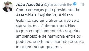 Em sua rede social, o governador João Azevêdo postou que as ameaças feitas ao chefe do Poder Legislativo afrontam democracia.