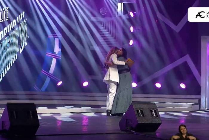 A cantora Bruna Karla, que está grávida, também ganhou um abraço da anfitriã da live. “Dá vontade de te dar um abraço. Ah, dá aqui um abraço!”, disse Aline enquanto, meio relutante, abraçava a colega.