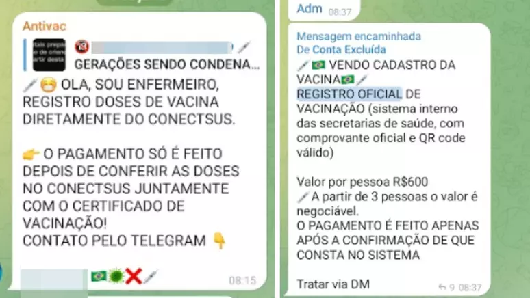 Em buscas por grupos abertos no Telegram – aplicativo de mensagem reconhecido por ter uma política de moderação de conteúdo quase nula e pouca transparência para com as autoridades brasileiras -, a imprensa encontrou diversas trocas de mensagens de pessoas que se dizem capazes de inserir dados falsos de vacinação diretamente pelo sistema DataSUS.
