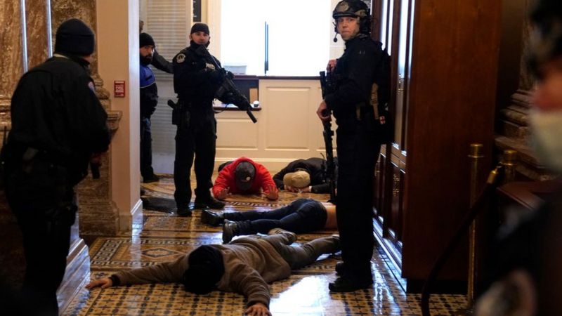 Depois de uma grande manifestação que contou com a presença de Trump em frente à Casa Branca, alguns participantes marcharam até o Capitólio para denunciar o que consideram uma fraude eleitoral — o republicano afirmou aos apoiadores presentes que “nunca concederia” a vitória de Biden.