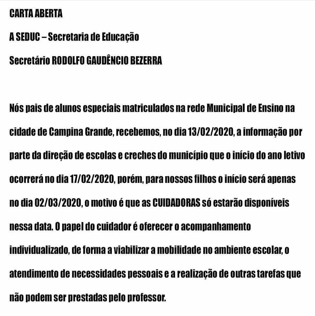 “Lamentavelmente a Secretária de Educação repete uma prática que vem ocorrendo nos últimos anos. Devemos lembrar que pela Lei das Diretrizes Básicas da Educação que regulamenta a educação no Brasil, as escolas devem cumprir 200 anos letivos. De acordo com a legislação atual, o ensino especial para alunos com deficiência deve ser oferecido preferencialmente na rede regular de ensino. Portanto, solicitamos que se faça se cumprir a Lei N° 13.146 e que nossos filhos tenham acesso e início das aulas na data prevista para o começo do ano letivo”, diz trecho da carta enviada pelos pais dos alunos especiais de Campina.