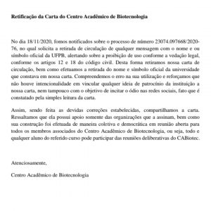 A carta foi assinada pelo Centro Acadêmico de Biotecnologia; Frente Biotec pela Democracia; Atlética Metagenômica; Linabiotec; e Maximize – Soluções em Biotecnologia.