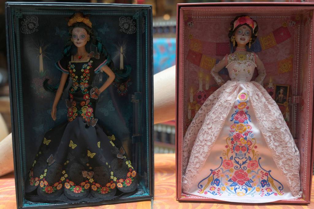 A Barbie do Dia dos Mortos, que custa em torno de US$ 72 (R$ 404) , usa neste ano um vestido de renda rosa, e seu rosto pálido é detalhado em cores brilhantes. Em 2019, ela se vestiu de preto.