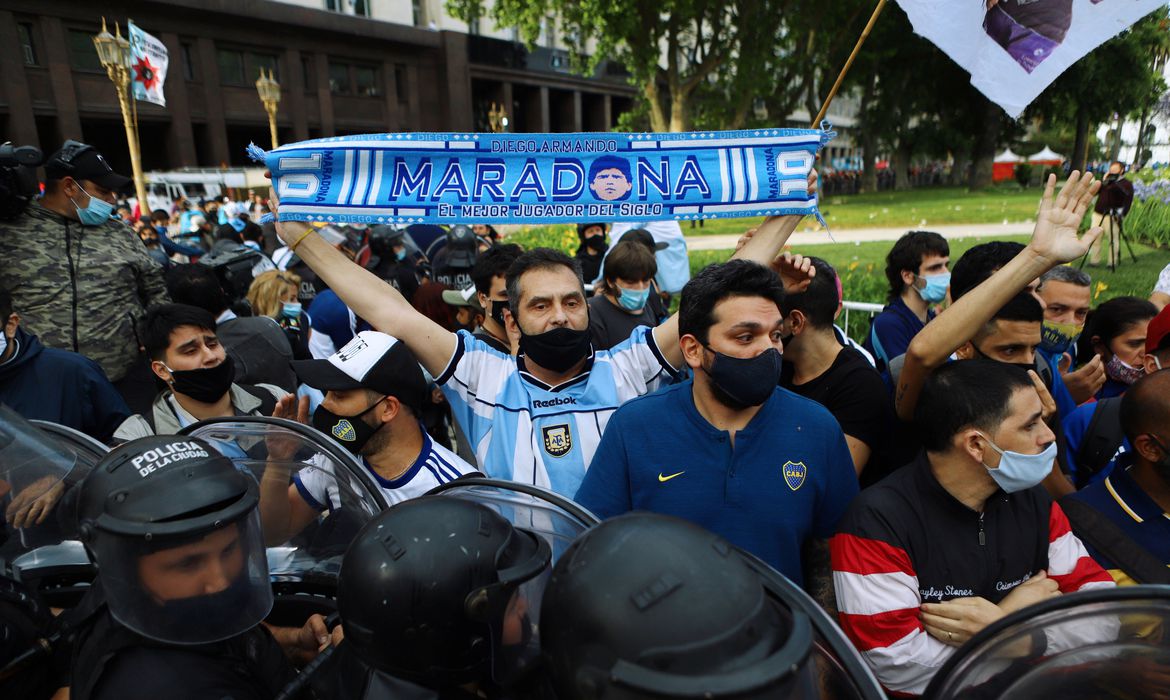 Dezenas de milhares de pessoas, muitas delas sem máscara, engrossavam uma longa fila sem distanciamento social para entrarem na Casa Rosada e se despedirem de Maradona, que morreu na quarta-feira de insuficiência cardíaca aos 60 anos.