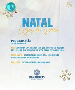 A prefeitura de Bananeiras anunciou nessa quarta (24) que a cidade terá uma programação especial para as festas natalinas. A programação natalina começa nesse dia 28.