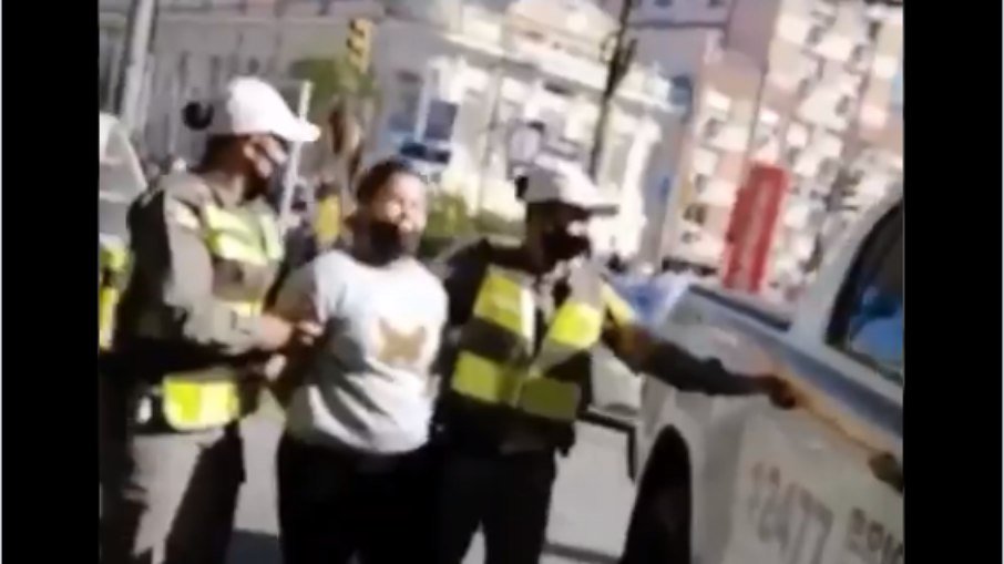 Uma mulher foi presa nesta tarde protestando contra o presidente Jair Bolsonaro em Porto Alegre (RS). Segundo manifestantes ao redor, ela estaria sendo levada pela Brigada Militar após bater panelas .