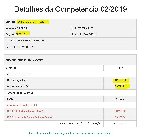 Na última atualização da folha de pessoal, em fevereiro, a enfermeira Kamila Gouveia de Souza está recebendo seus provimentos.