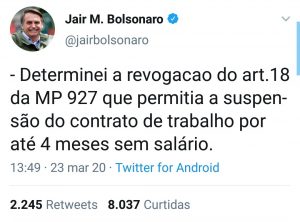 O presidente Jair Bolsonaro voltou atrás e revogou o artigo da Medida Provisória que versa sobre a suspensão do contrato de trabalho por até 4 meses devido à pandemia de coronavírus no país. A decisão foi informada por meio de sua conta do twitter. Veja: