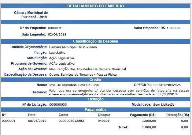 A diária do fotógrafo foi paga para a prestação de serviço realizada no Dia das Mães deste ano. O empenho foi feito no dia 2 de abril, no valor de R$ 1 mil, para a empresa de José de Arimateia Lima da Silva. Veja o comprovante do Sagres do Tribunal de Contas da Paraíba: