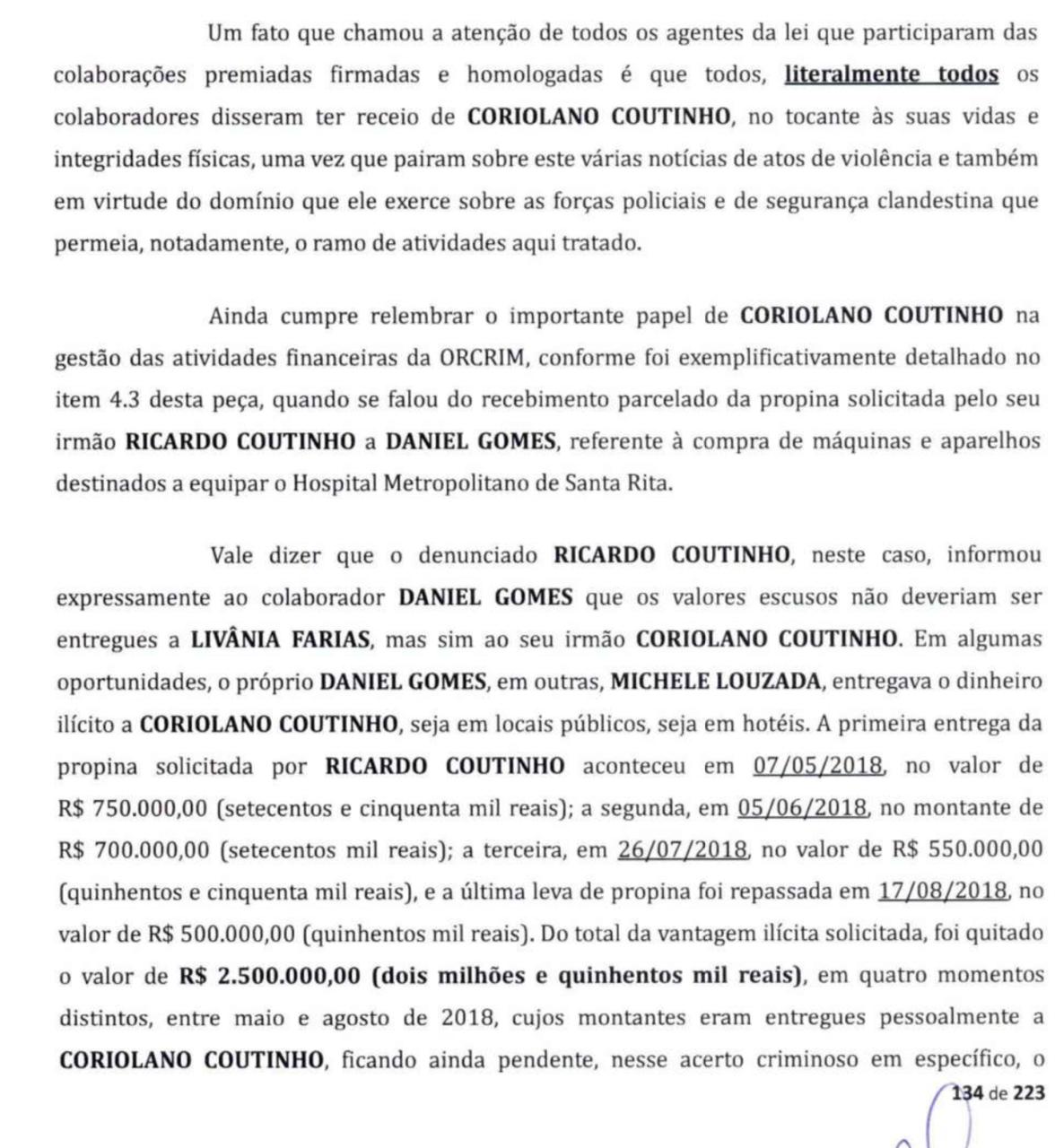 Um trecho do relatório do Ministério Público da Paraíba sobre a operação Calvário aponta que a maioria dos acusados e colaboradores por delação premiada teriam medo, até mesmo pela própria vida, de Coriolano Coutinho, irmão do ex-governador Ricardo Coutinho.