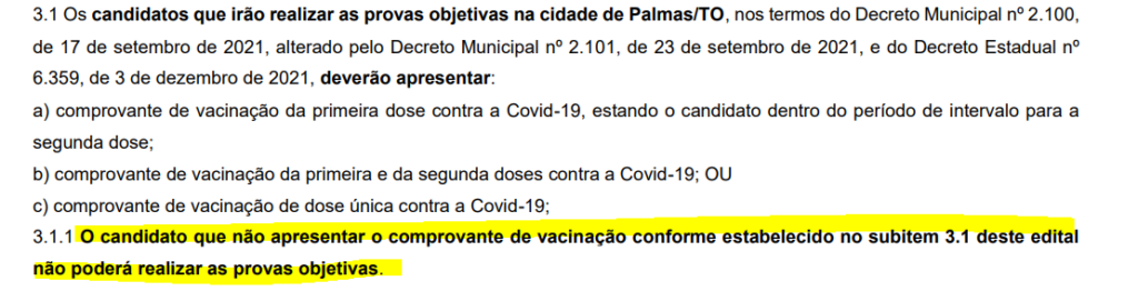 Vale a pena ressaltar que esse não foi o primeiro episódio de exigência do comprovante de vacinação em Tocantins devido aos decretos. Os concursos MPE TO e Ibama também exigiram o passaporte da vacina de candidatos inscritos.