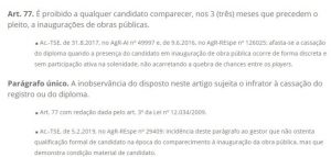 Os candidatos que participarem da cerimônia de inauguração da Usina Fotovoltaica de Coremas e de divulgação do Programa de Eficiência Energética que acontecerá na quinta-feira (17) com a presença do presidente Jair Bolsonaro poderão ter seus registros de candidatura cassados pela Justiça Eleitoral.