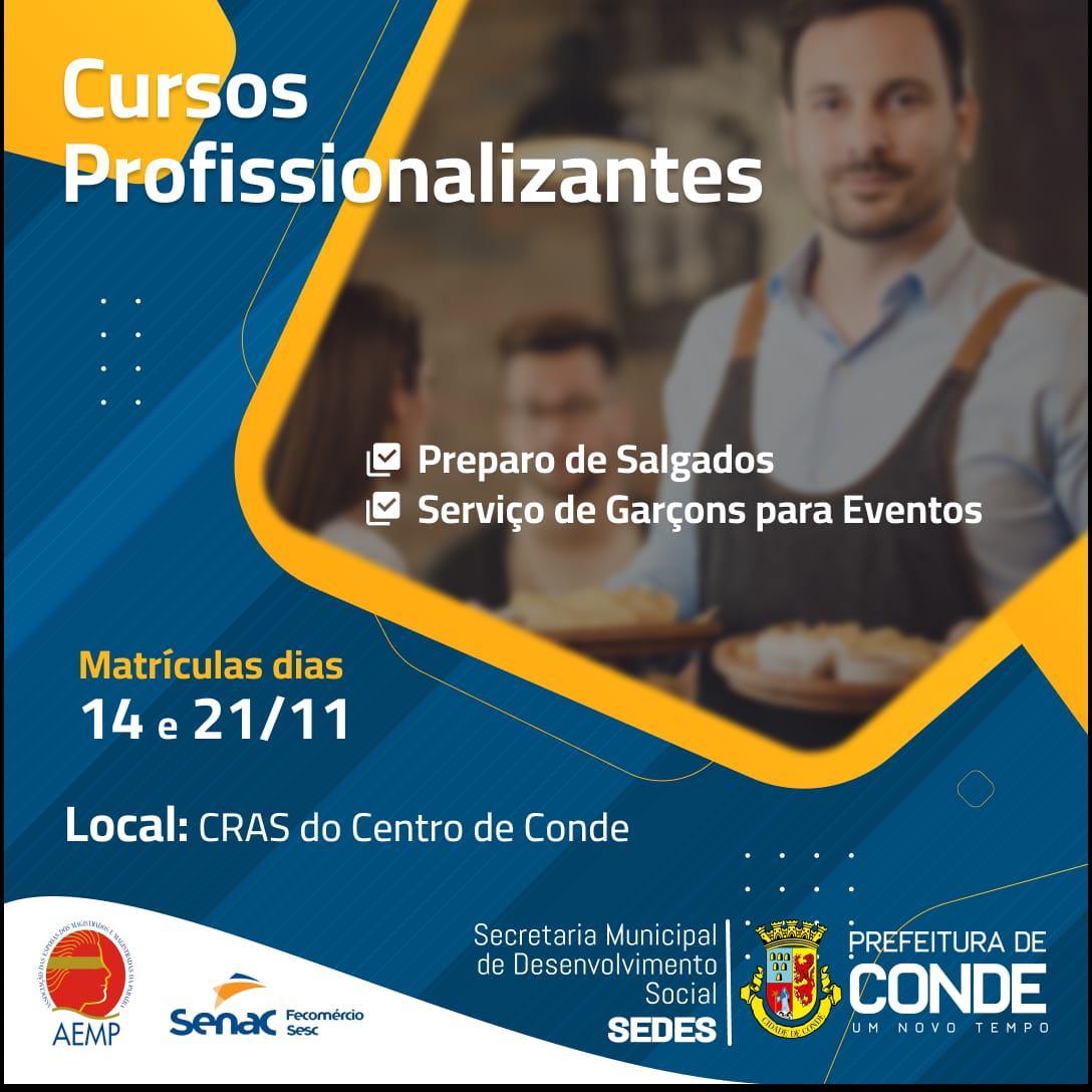 A Prefeitura de Conde por meio da Secretaria de Desenvolvimento Social em parceria com o SENAC e a Associação das Esposas dos Magistrados e Magistradas da Paraíba (AEMP), estão abrindo inscrições para cursos profissionalizantes no município. São 15 vagas para os cursos de Preparo de Salgados e Serviço de Garçom para Eventos. As inscrições são gratuitas e serão realizadas nos dias 14 e 21 de novembro no CRAS do Centro de Conde.