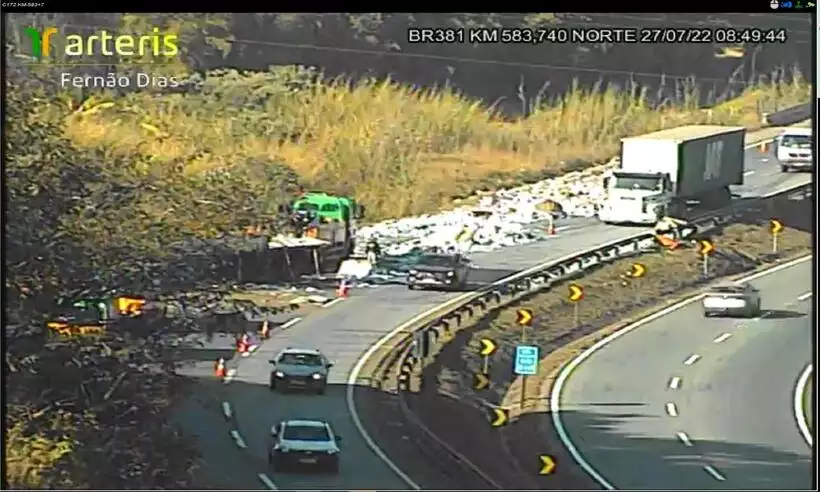 Um acidente envolvendo dois caminhões complica a vida dos motoristas que passam pela rodovia Fernão Dias, na altura do km 584, em Carmópolis de Minas, na Região Centro-Oeste de Minas, sentido Belo Horizonte, na manhã desta quarta-feira (27/07).