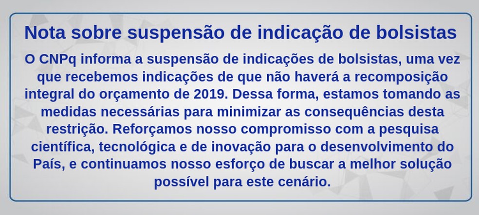 “O CNPq informa a suspensão de indicações de bolsistas, uma vez que recebemos indicações de que não haverá recomposição integral do orçamento de 2019”, disse o CNPq em nota. “Dessa forma, estamos tomando as medidas necessárias para minimizar as consequências desta restrição”.