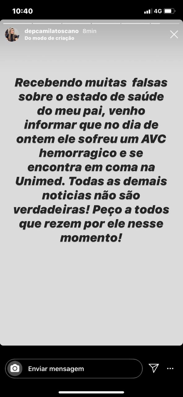 O prefeito de Guarabira segue internado no Hospital da Unimed em coma. Camila Toscano, filha e deputada estadual, pede orações.