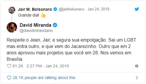 Quando Wyllys anunciou que ia deixar o país, o vereador respondeu a um tuíte do presidente Jair Bolsonaro (PSL), com a mensagem “Grande dia!”, afirmando que “sai um LGBT, mas entra outro” –os posts não faziam menção direta ao fato de Wyllys deixar o país.