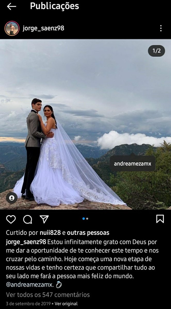 A imagem fora compartilhada pelo modelo Jorge Saenz em 2019. É ele que aparece ao lado de Andrea. Internautas e fãs do concurso dizem que, por conta da polêmica, a legenda da imagem foi alterada por ele. “Estou infinitamente agradecido com Deus por me dar a oportunidade de concecer este tempo e nos cruzar pelo caminho. Hoje começa uma nova etapa de nossas vidas e tenho certeza que compartilhar tudo a seu lado me fará a pessoa mais feliz do mundo”, diz a legenda postada na época, em que ele chegou até a receber felicitações. Conforme os fãs dos concurso, o texto foi alterado, onde foi acrescentado o trecho “Campanha publicitária”, fazendo menção de que, na verdade, aquilo era um trabalho.