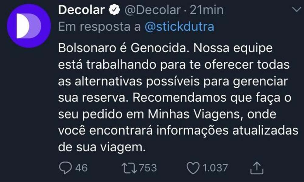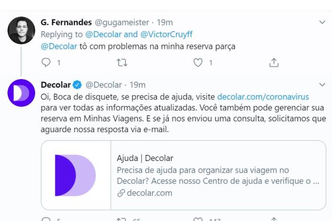 O robô, que interage automaticamente, responde com os xingamentos que estão no nome dos usuários. Procurada, a Decolar informou que houve uma falha na configuração de seu sistema de respostas automáticas em seu perfil no Twitter. “Lamentamos qualquer inconveniente que esta situação tenha provocado. O problema foi resolvido e foram tomadas as providências necessárias para evitar novas ocorrências”.