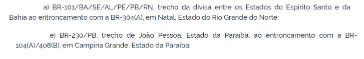 Dentre as rodovias listadas, estão o trecho da BR-230 entre João Pessoa e Campina Grande. Além disso, o outro trecho relacionado é a BR-101 desde a Bahia até o Rio Grande do Norte. Isso significa que a BR-101 entre João Pessoa e Recife e João Pessoa e Natal também estão na lista.