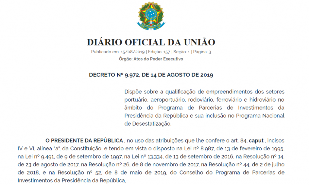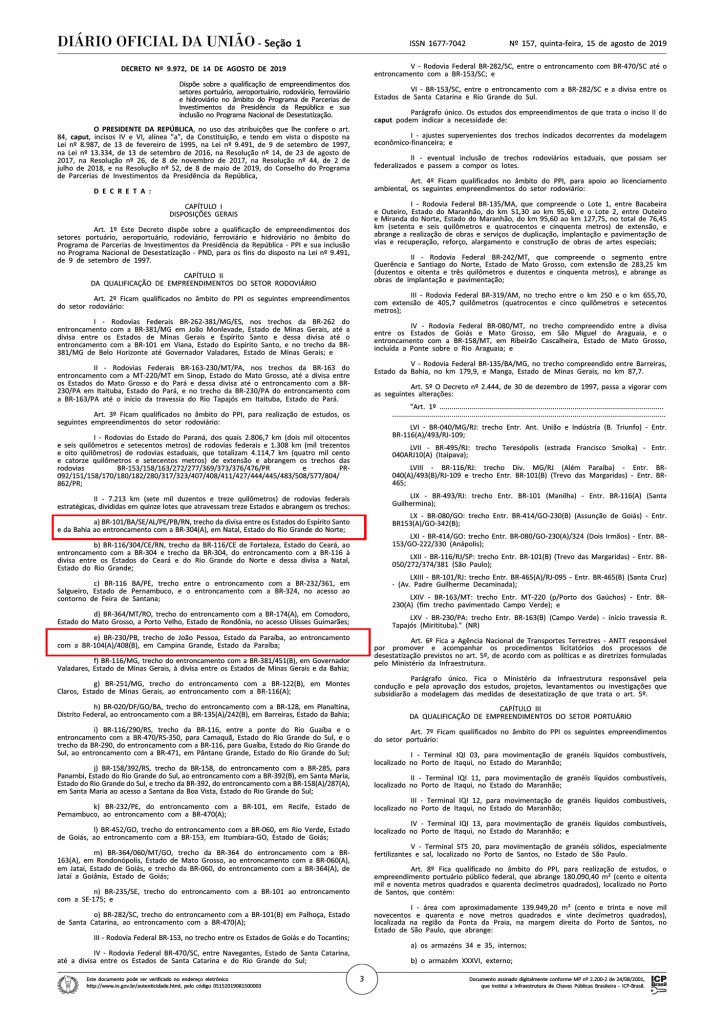 As Brs 230 e 101, que cortam a Paraíba poderão ser privatizadas pelo Governo Federal, de acordo com decreto publicado na edição do Diário Oficial da União desta quinta-feira (15). O presidente Jair Bolsonaro determinou que sejam realizados estudos sobre a viabilidade de desestatizar vários trechos de rodovias federais em todo o país.