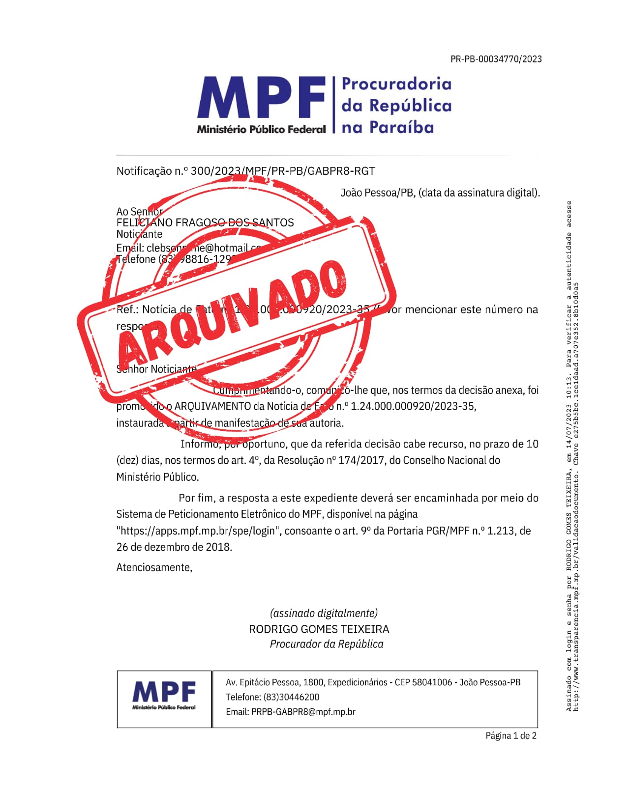 O Ministério Público Federal – Procuradoria da República da Paraíba, comunica o arquivamento de denúncia promovida pelo vereador Barra de Camaratuba (Cidadania) contra a prefeita de Mamanguape, Eunice Pessoa (PSB) e seus secretários na compra de insumos durante a pandemia da COVID-19.