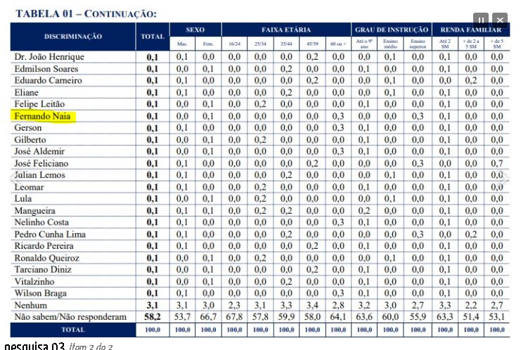 Fernando Naia, prefeito de Rio Tinto, é um dos nomes lembrados pelos paraibanos. De acordo com o levantamento com resposta espontânea, João Azevedo (Cidadania), foi o mais citado com 10,9%, seguido pelo ex-governador Ricardo Coutinho (PSB), com 7,8%, e o ex-senador Cássio Cunha Lima (PSDB), com 4,5%.