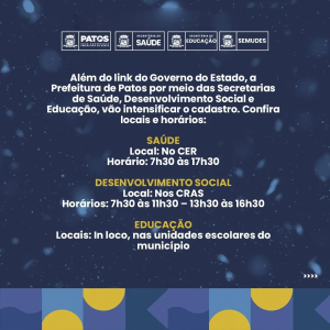 Para as pessoas que precisam de auxílio na realização do cadastro, as secretarias municipais citadas estão com equipes para dar suporte ao longo de toda a semana.