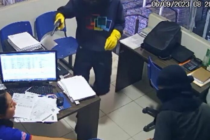 Um vídeo mostra a ação criminosa. Os bandidos usando capacete, máscaras e fortemente armados invadem o escritório. Ao fundo da imagem é possível verificar outro assaltante ameaçando uma vítima.
