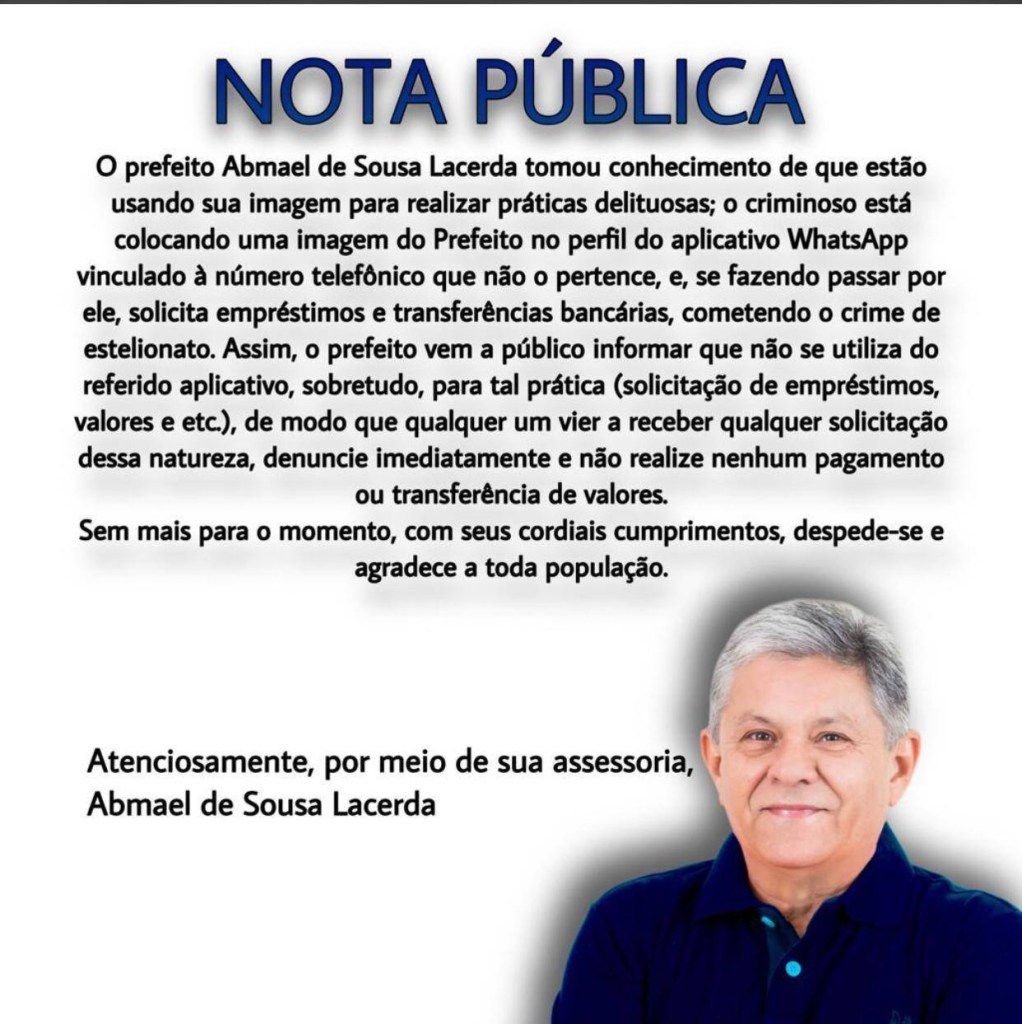 O prefeito de Pombal, Abmael de Sousa Lacerda, conhecido como Dr. Verissinho, foi vítima de um golpe do whatsapp nesse final de semana após um estelionatário criar um perfil falso, no aplicativo WhatsApp, no nome do gestor, para solicitar dinheiro a comerciantes e outras pessoas da cidade.