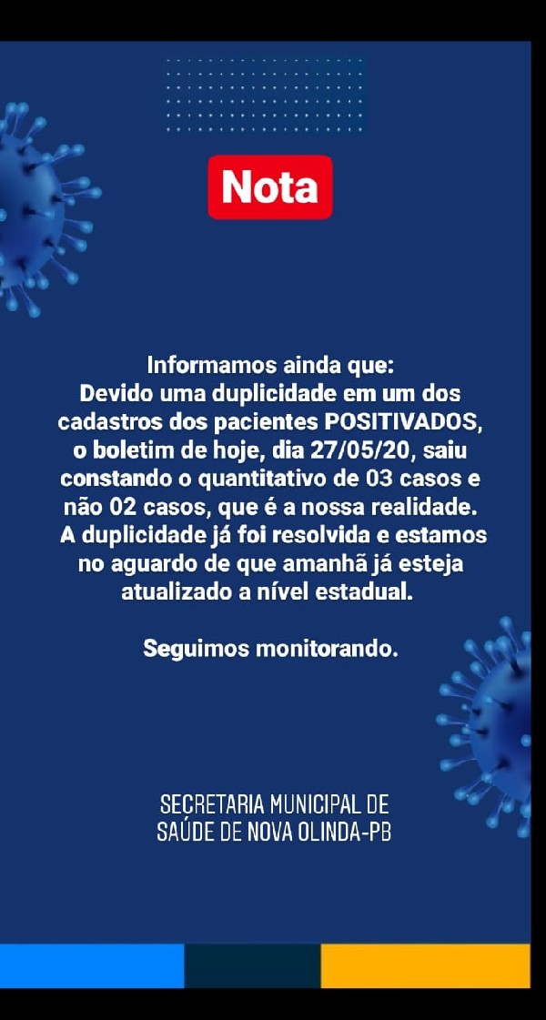 A prefeitura de Nova Olinda informa a todos que o terceiro caso de COVID-19 registrado na cidade é um caso de duplicidade.