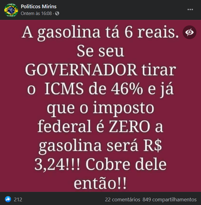 Outra parte da mensagem diz que, “se o governador tirar o ICMS de 46%” da gasolina, será possível reduzir o valor cobrado na bomba. A tabela da Fecombustíveis, porém, mostra que o ICMS sobre a gasolina varia de 25% a 34%, percentuais mais baixos que o citado na mensagem.