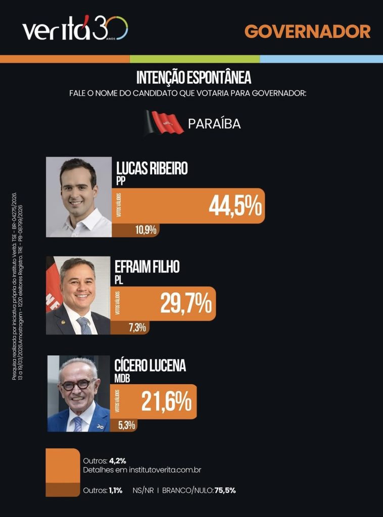 O senador Efraim Filho (PL) ganhou força na corrida pelo Governo da Paraíba e aparece em segundo lugar na mais recente pesquisa de intenção de voto do Instituto Veritá, com 29,7%, consolidando-se na disputa direta por uma vaga no segundo turno.