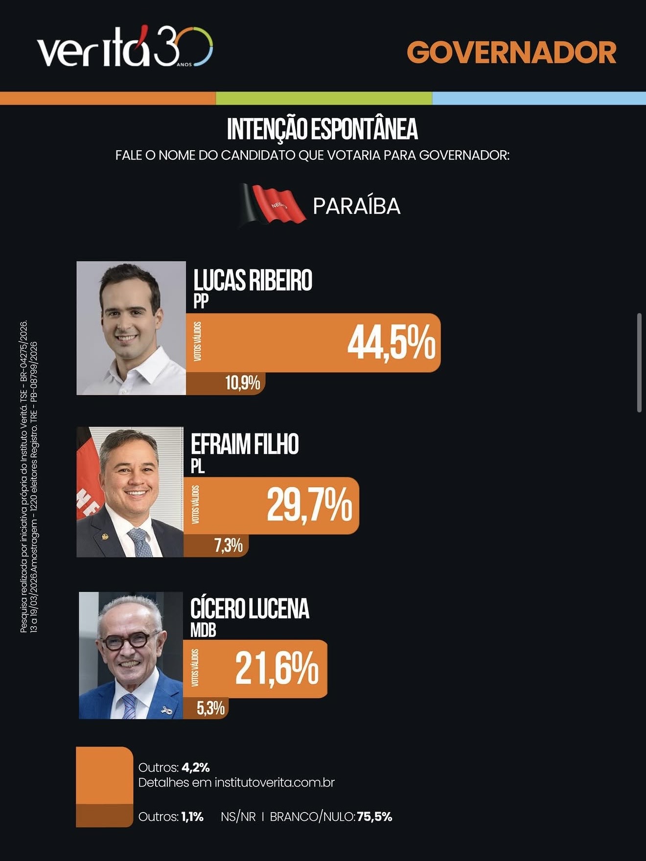 O senador Efraim Filho (PL) ganhou força na corrida pelo Governo da Paraíba e aparece em segundo lugar na mais recente pesquisa de intenção de voto do Instituto Veritá, com 29,7%, consolidando-se na disputa direta por uma vaga no segundo turno.
