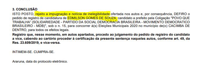 A candidato do MDB continua elegível após a 20ª Zona Eleitoral de Araruna decidiu pela rejeição da impugnação da candidatura.