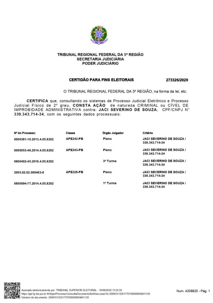Em documentação enviada pelo pré-candidato para solicitação do registro à Justiça Eleitoral, anexada ao processo número 0600024-42.2020.6.15.0069, é revelado que Galego de Souza possui pelo menos cinco ações criminal ou cível por atos de improbidade administrativa.