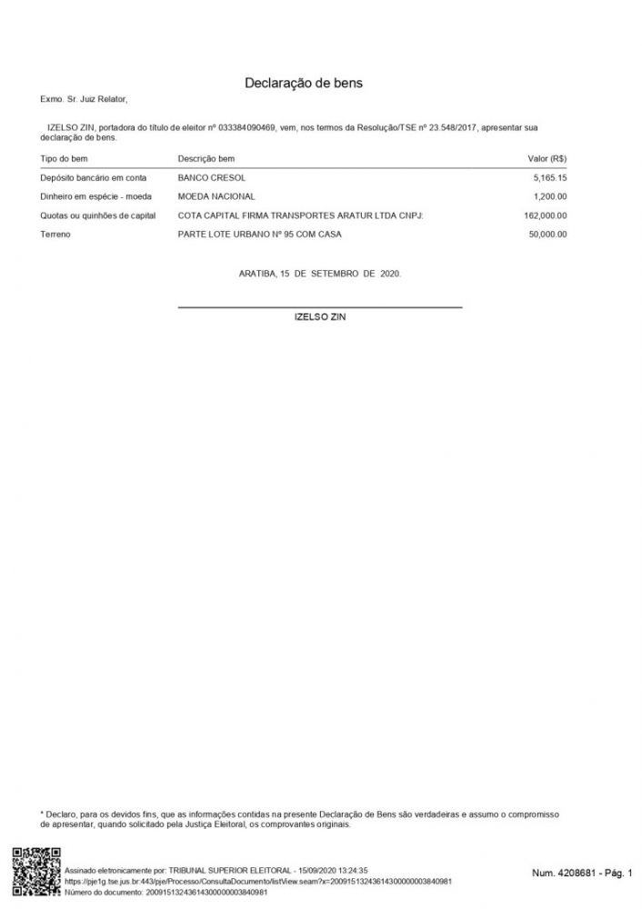 Ainda na documentação enviada à Justiça Eleitoral, a declaração de bens apresentada por Galego de Souza, está constando em nome de terceiro. Conforme documento anexado aos autos, não foi declarado no nome de Galego de Souza qualquer patrimônio, mas declarou bens em nome de uma pessoa identificada como Izelso Zin, portadora do título de eleitor nº 033384090469. Foram declarados bens em nome de Izelso Zin no valor total de R$ 218.365,15.