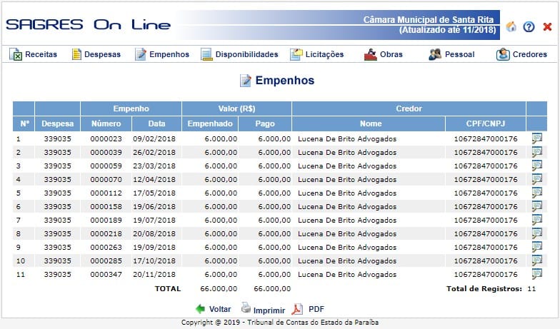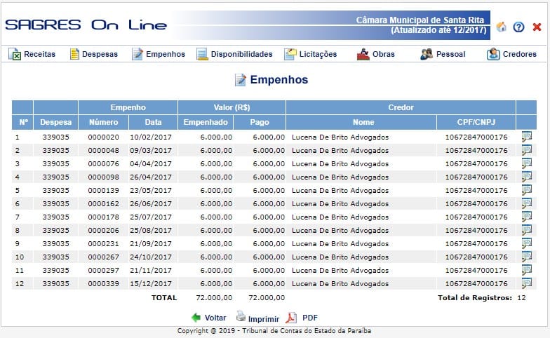 Um terceiro escritório, “Lucena de Brito Advogados” também presta serviços no segmento do direito para Câmara de Santa Rita, e junto ao TCE usou a mesma justificativa para receber R$ 66 mil reais.