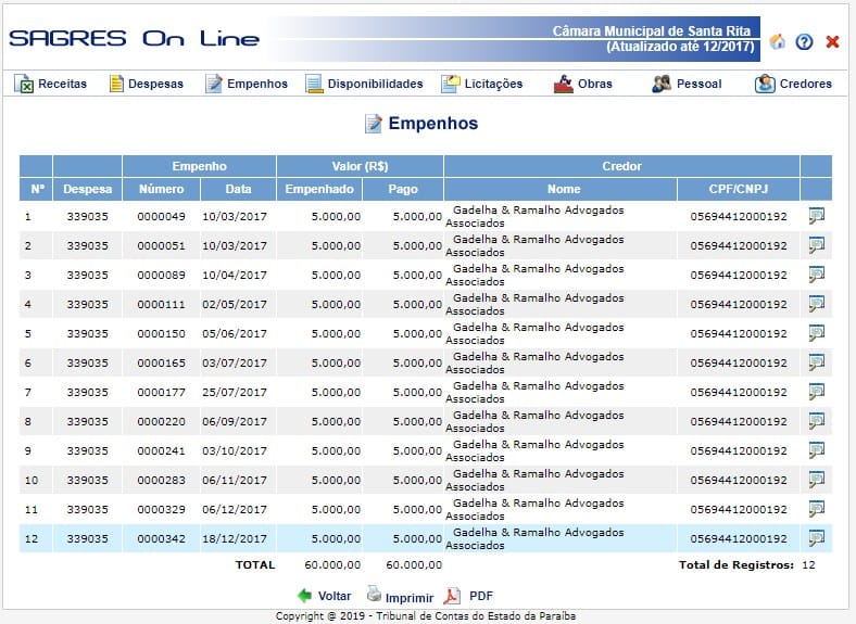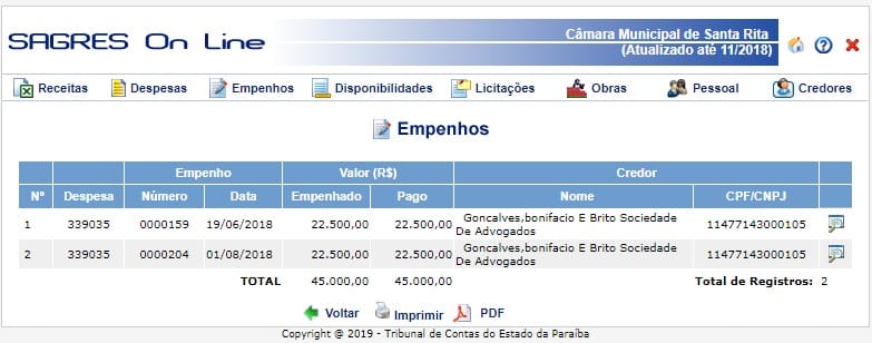 Apenas com advogados foram mais R$ 300 mil reais foram gastos nesse tipo de serviço entre 2017 e 2018.