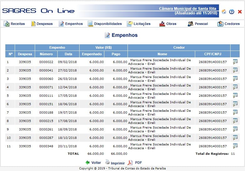 Já o escritório de Marcus Freire recebe mensalmente R$ 6 mil reais para “prestação de serviços advocatícios a esta edilidade”, assim vem sendo justificado no SAGRES do Tribunal de Contas da Paraíba. Em 2018 o escritório recebeu R$ 66 mil reais.