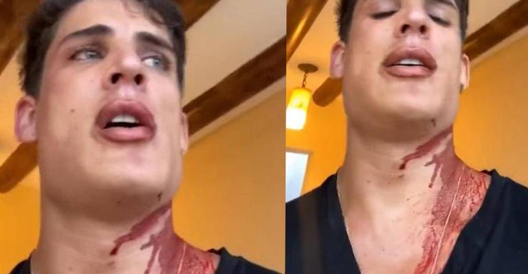 Tiago mostrou o rosto com machucados, a mandíbula e a boca inchadas, e bastante sangue na região da nuca. Um tanto desorientado, o modelo contou sobre o ocorrido dando a entender que apanhou de dois homens e um terceiro o atingiu com uma faca nas costas.