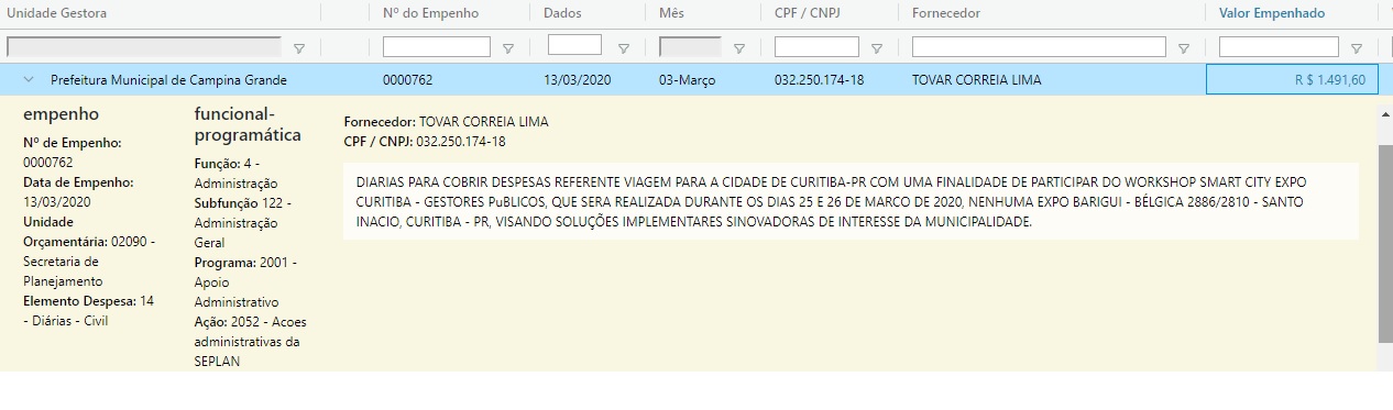 Segundo dados que constam no Sagres do Tribunal de Contas do Estado (TCE), o secretário Tovar recebeu da PMCG o valor de R$ 1.491,60 da PMCG para participar de um Workshop na cidade de Curituba – PR (https://www.smartcityexpocuritiba.com/) a ser realizado nos dias 18 e 19 de junho de 2020. Inicialmente o evento seria realizado em março, mas devido pandemia do Covid-19, foi adiado para junho. Ocorre que o pagamento foi feito em março como se pode ser visto no link do TCE: https://sagresonline.tce.pb.gov.br/ e em anexo.