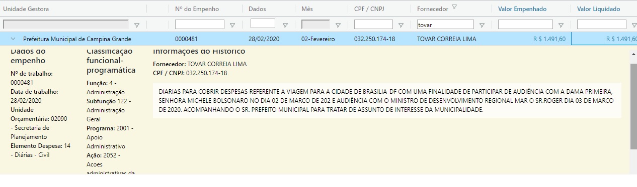 Em fevereiro deste ano, Tovar já havia recebido o mesmo valor de R$ 1.491,60 da PMCG para encontro com a Primeira Dama, Michelle Bolsonaro e com o Ministro do Desenvolvimento. Veja: https://sagresonline.tce.pb.gov.br/ e em anexo. Semana passada o tucano foi visto colocando uma mascará de proteção na estátua de Jackson do Pnadeiro, que fica as margas do Açude Velho, em Campina Grande, enquanto servidores da saúde municipal conclamavam por meio de da imprensa Equipamentos de Proteção Individual, os EPI´s.
