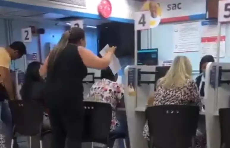 Ela pergunta pelo gerente do estabelecimento e, com prints da conversa íntima em mãos, se dirige a amante. “Cuidado com teu marido, isso é uma prostituta”, acrescentou a esposa, que revelou que havia fotos de nudez na conversa.